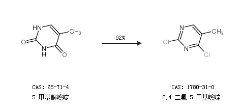 1.通過5-甲基脲嘧啶合成2,4-二氯-5-甲基嘧啶,收率約92%;