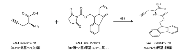 1.通過(2S)-2-氨基-4-戊炔酸和(9H-芴-9-基)甲基 2,5-二氧代吡咯烷-1-羧酸合成Fmoc-L-炔丙基甘氨酸,收率約66%;