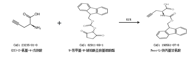 2.通過(2S)-2-氨基-4-戊炔酸和9-芴甲基-N-琥珀酰亞胺基碳酸酯合成Fmoc-L-炔丙基甘氨酸,收率約61%;
