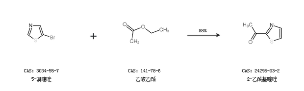 1.通過5-溴噻唑和乙酸乙酯合成2-乙?;邕?,收率約88%;