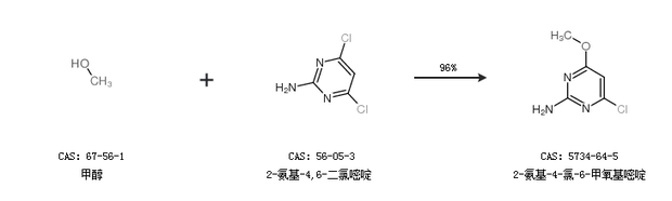 1.通過(guò)2-氨基-4,6-二氯嘧啶和甲醇鈉合成2-氨基-4-氯-6-甲氧基嘧啶,收率約96%;