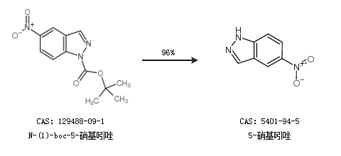 2.通過N-(1)-boc-5-硝基吲唑合成5-硝基吲唑,收率約96%;