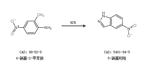 1.通過4-硝基-2-甲苯胺合成5-硝基吲唑,收率約92%;