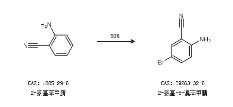 2.通過2-氨基苯甲腈合成2-氨基-5-溴苯甲腈,收率約50%;