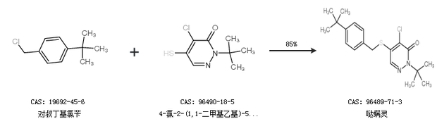 1.通過(guò)對(duì)叔丁基氯芐和4-氯-2-(1,1-二甲基乙基)-5-疏基-3(2H)-吡嗪酮合成噠螨靈,收率約85%;