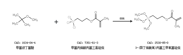 1.通過(guò)甲基叔丁基醚和甲基丙烯酸丙基三氯硅烷合成3-(異丁烯酰氧)丙基三甲氧基硅烷,收率約89%;