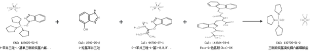 1.通過(guò)1H-苯并三唑-1-基氧三吡咯烷基六氟磷酸鹽、1-羥基苯并三唑、O-(苯并三唑-1-基)-N,N,N'',N''-四甲基脲六氟磷酸酯和Fmoc-L-色氨酸(Boc)-OH合成三吡咯烷基溴化鏻六氟磷酸鹽