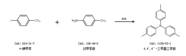 1.通過(guò)4-碘甲苯和對(duì)甲苯胺合成4,4'',4''''-三甲基三苯胺,收率約82%;