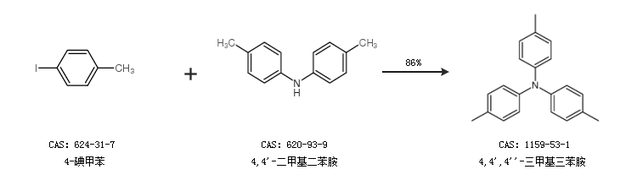 2.通過(guò)4-碘甲苯和4,4''-二甲基二苯胺合成4,4'',4''''-三甲基三苯胺,收率約86%;