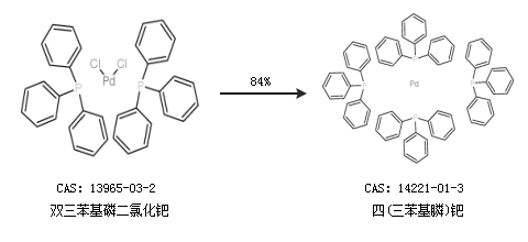 2.通過雙三苯基磷二氯化鈀合成四(三苯基膦)鈀,收率約84%;