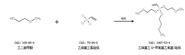 1.通過乙二醇甲醚和乙烯基三氯硅烷合成乙烯基三(2-甲氧基乙氧基)硅烷,收率約46%;