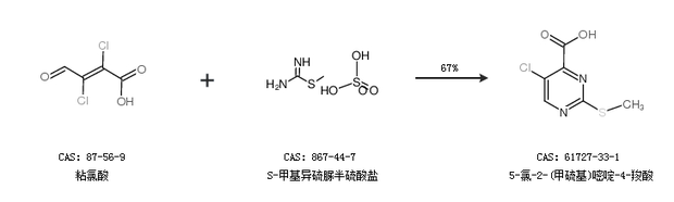 2.通過(guò)粘氯酸和S-甲基異硫脲半硫酸鹽合成5-氯-2-(甲硫基)嘧啶-4-羧酸,收率約67%;