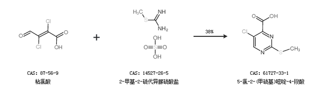 1.通過(guò)粘氯酸和2-甲基-2-硫代異脲硫酸鹽合成5-氯-2-(甲硫基)嘧啶-4-羧酸,收率約38%;