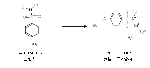 中文別名 氯胺T鈉;氯胺T三水合物;氯胺T,三水合物;三水合氯銨-T;對甲苯磺酰氯胺鈉三水合物;對甲苯;