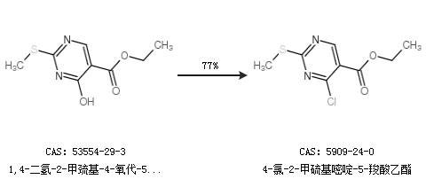 1.通過1,4-二氫-2-甲巰基-4-氧代-5-嘧啶甲酸乙酯合成4-氯-2-甲硫基嘧啶-5-羧酸乙酯,收率約77%;