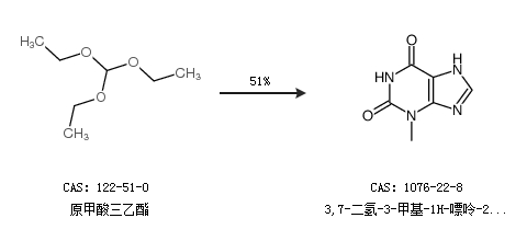 2.通過原甲酸三乙酯合成3,7-二氫-3-甲基-1H-嘌呤-2,6-二酮,收率約51%;