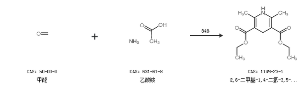 1.通過甲醛和乙酸銨合成2,6-二甲基-1,4-二氫-3,5-吡啶二羧酸二乙酯,收率約84%;