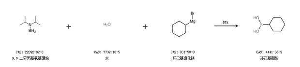 1.通過(guò)N,N-二異丙基氨基硼烷、水和環(huán)己基溴化鎂合成環(huán)己基硼酸,收率約97%;