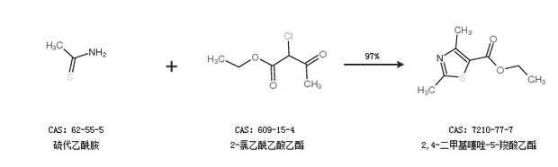 1.通過(guò)硫代乙酰胺和2-氯乙酰乙酸乙酯合成2,4-二甲基噻唑-5-羧酸乙酯,收率約97%;