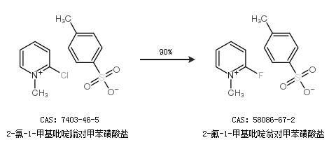 2.通過2-氯-1-甲基吡啶鎓對甲苯磺酸鹽合成2-氟-1-甲基吡啶翁對甲苯磺酸鹽,收率約90%;
