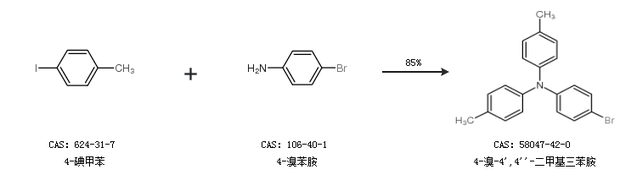 2.通過(guò)4-碘甲苯和4-溴苯胺合成4-溴-4'',4''''-二甲基三苯胺,收率約85%;
