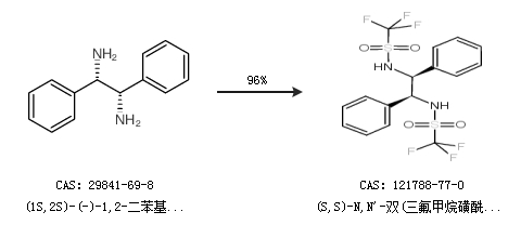 1.通過(1S,2S)-(-)-1,2-二苯基乙二胺合成(S,S)-N,N''-雙(三氟甲烷磺酰)-1,2-二苯基乙二胺,收率約96%;