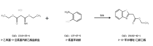 2.通過3-乙氧基-3-亞氨基丙酸乙酯鹽酸鹽和2-氨基苯硫醇合成2-(2-苯并噻唑)乙酸乙酯,收率約58%;