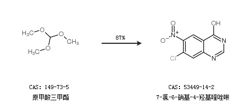 1.通過原甲酸三甲酯合成7-氯-6-硝基-4-羥基喹唑啉,收率約87%;