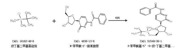 2.通過叔丁基二甲基氯硅烷和N-苯甲酰-2''-脫氧胞苷合成N-苯甲?;?5’-O-叔-丁基二甲基甲硅烷-2’-脫氧胞啶,收率約49%;