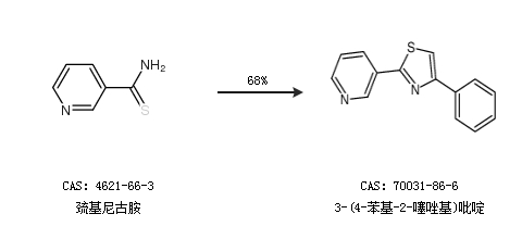 1.通過巰基尼古胺合成3-(4-苯基-2-噻唑基)吡啶,收率約68%;