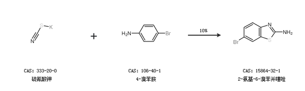 1.通過硫氰酸鉀和4-溴苯胺合成2-氨基-6-溴苯并噻唑,收率約10%;