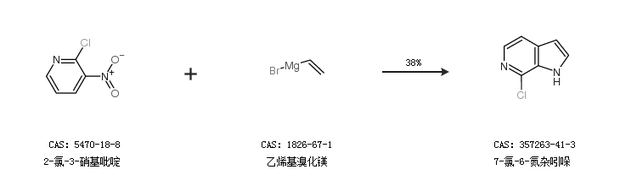 1.通過(guò)2-氯-3-硝基吡啶和乙烯基溴化鎂合成7-氯-6-氮雜吲哚,收率約38%;