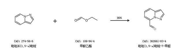 1.通過吡唑并[1,5-a]吡啶和甲酸乙酯合成吡唑[1,5-a]吡啶-7-甲醛,收率約86%;