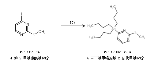 2.通過4-碘-2-甲基磺?;奏ず铣?-三丁基甲錫烷基-2-硫代甲基嘧啶,收率約50%;