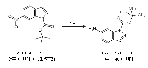 1.通過(guò)6-硝基-1H-吲唑-1-羧酸叔丁酯合成1-Boc-6-氨-1H-吲唑,收率約96%;