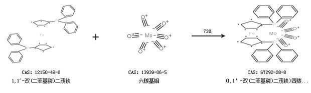 1.通過1,1''-雙(二苯基膦)二茂鐵和六羰基鉬合成(1,1’-雙(二苯基磷)二茂鐵)四羰基鉬,收率約73%;
