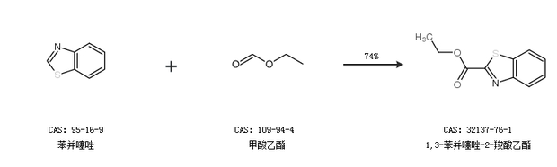 1.通過苯并噻唑和甲酸乙酯合成1,3-苯并噻唑-2-羧酸乙酯,收率約74%;