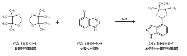 1.通過聯(lián)硼酸頻那醇酯和4-溴-1H-吲唑合成1H-吲唑-4-硼酸頻哪醇酯,收率約60%;
